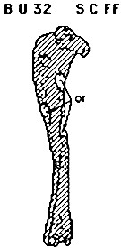 Unit consists of essentially complete element, with the exception of a missing anterior crest. Opposite of BU 13 and similar to BU 24, except the shaft of the bone is complete. (WU)