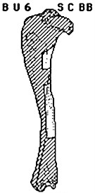 Same as BU 5 except nutrient foramen absent. Frequency indicates number of pieces represented by BU 6 and not number of elements.