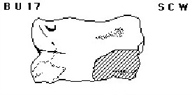 Element with posterior medial edge missing. Posterior lateral edge intact. Drawing visually similar to BU 22. (GL)
